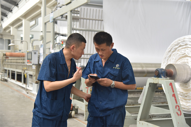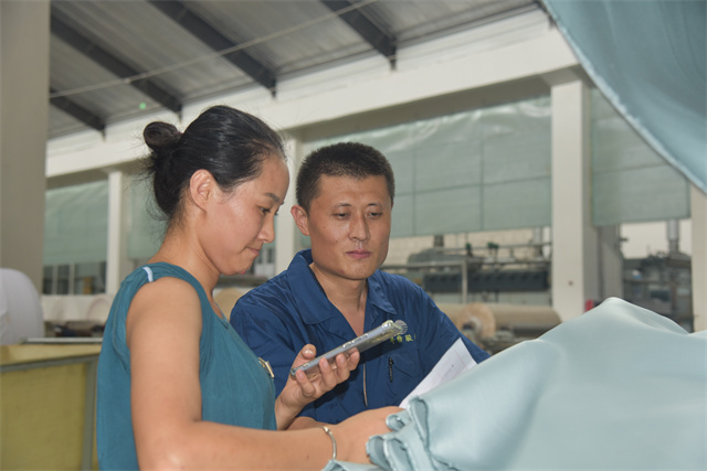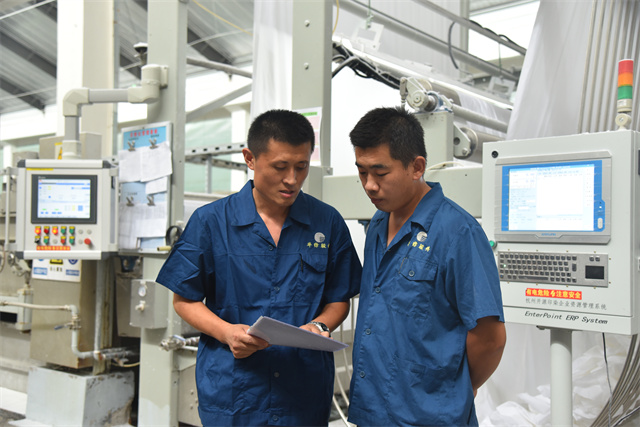 孫鎮(zhèn)身著工裝,每天巡回在車間前處理機(jī)臺(tái)之間,和暢的機(jī)聲成了他工作之時(shí)的伴奏。落實(shí)各機(jī)臺(tái)的計(jì)劃,組織各機(jī)臺(tái)生產(chǎn)跟進(jìn),管控本班的產(chǎn)品質(zhì)量,對(duì)操作規(guī)范進(jìn)行及時(shí)檢查、現(xiàn)場(chǎng)糾偏與指導(dǎo)培訓(xùn)。他一心撲在工作上,每天忙得不亦樂乎,目標(biāo)是帶領(lǐng)全班19名成員保質(zhì)保量地完成車間下達(dá)的任務(wù)目標(biāo)。他說,“做好生產(chǎn)工作有兩件法寶:一個(gè)是責(zé)任感,一個(gè)就是精益生產(chǎn)意識(shí)。”在孫鎮(zhèn)的心目中,作為公司的管理主線,精益生產(chǎn)需要全體“華紡人”共同傾心“打磨”,在時(shí)間里“磨”出真功夫來,干工作沒有捷徑,反復(fù)推敲,仔細(xì)琢磨;經(jīng)過工作實(shí)踐的摸爬滾打,才能提升自身本領(lǐng),才會(huì)使生產(chǎn)工作一步步精進(jìn)。