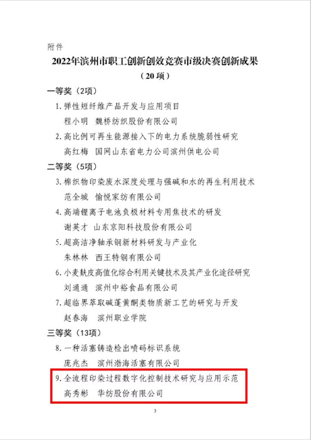 近日,濱州市總工會(huì)下發(fā)了《關(guān)于公布2022年濱州市職工創(chuàng)新創(chuàng)效競(jìng)賽市級(jí)決賽創(chuàng)新成果名單的通知》。公司由信息互聯(lián)部軟件開(kāi)發(fā)組主管高秀彬組織開(kāi)發(fā)的“全流程印染過(guò)程數(shù)字化控制技術(shù)研究與應(yīng)用示范”項(xiàng)目榮獲三等獎(jiǎng)。