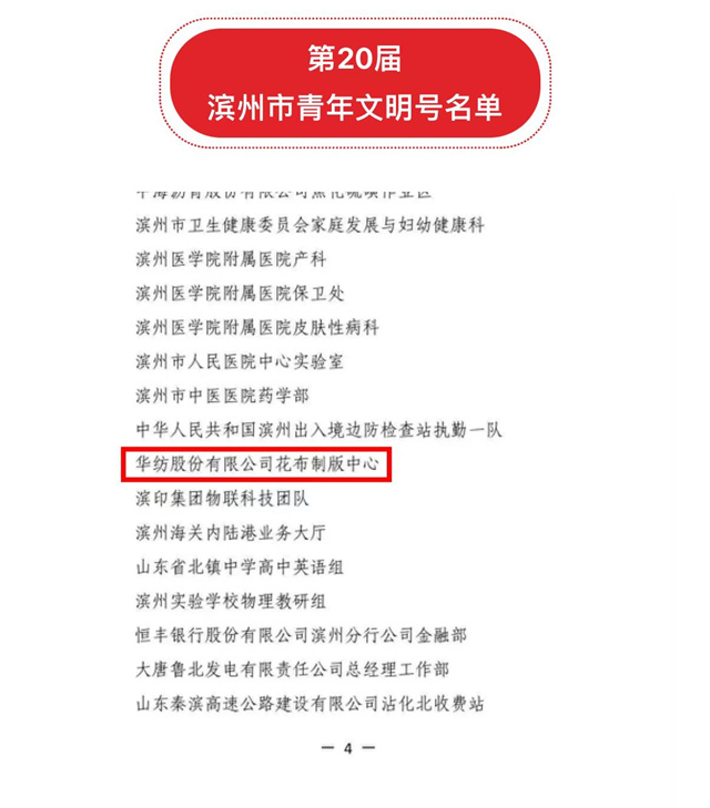 導(dǎo)讀:11月8日,濱州市創(chuàng)建青年文明號活動組委會發(fā)布《關(guān)于命名第20屆“濱州市青年文明號”的決定》,經(jīng)逐級認(rèn)定、嚴(yán)格審核、社會公示,公司花布制版中心獲第20屆“濱州市青年文明號”