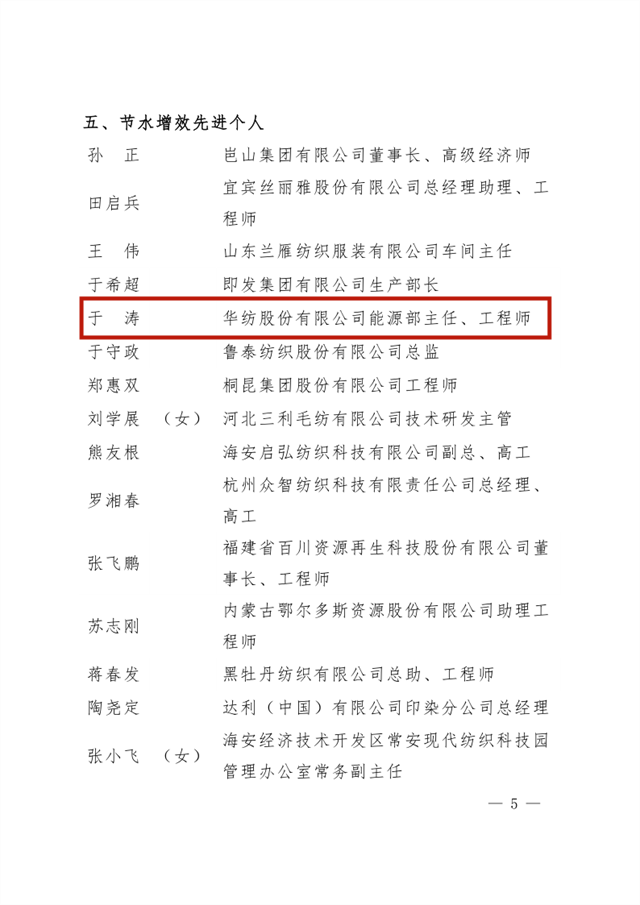 導(dǎo)讀:公司在全國紡織行業(yè)綠色發(fā)展勞動競賽中獲評“節(jié)水標(biāo)桿企業(yè)”榮譽稱號、公司系統(tǒng)工程部能源副總工于濤榮獲“節(jié)水增效先進個人”榮譽稱號。