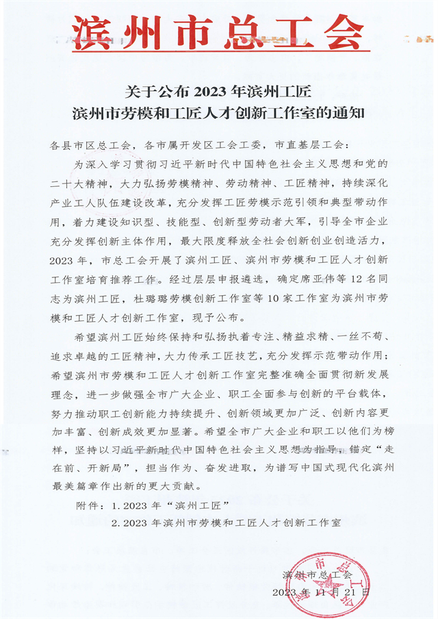 導讀:近日,濱州市總工會下發(fā)了《關(guān)于公布 2023 年濱州工匠濱州市勞模和工匠人才創(chuàng)新工作室的通知》,