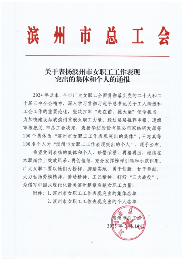 近日,濱州市總工會(huì)公布《關(guān)于表?yè)P(yáng)濱州市女職工工作表現(xiàn)突出的集體和個(gè)人的通報(bào)》文件,家紡研發(fā)部憑借卓越的工作表現(xiàn)和突出貢獻(xiàn),榮獲“濱州市女職工工作表現(xiàn)突出的集體”榮譽(yù)稱號(hào)。